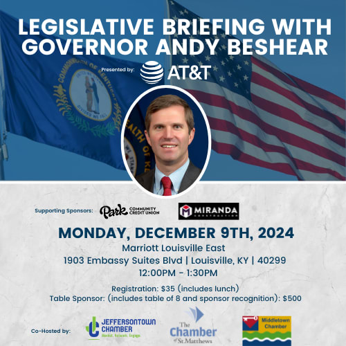 The Jeffersontown Chamber is thrilled to co-host a Legislative Briefing with the Chamber of St. Matthews and the Middletown Chamber of Commerce, featuring Governor Andy Beshear! Join us to hear directly from the Governor about key updates and developments from the legislative session.