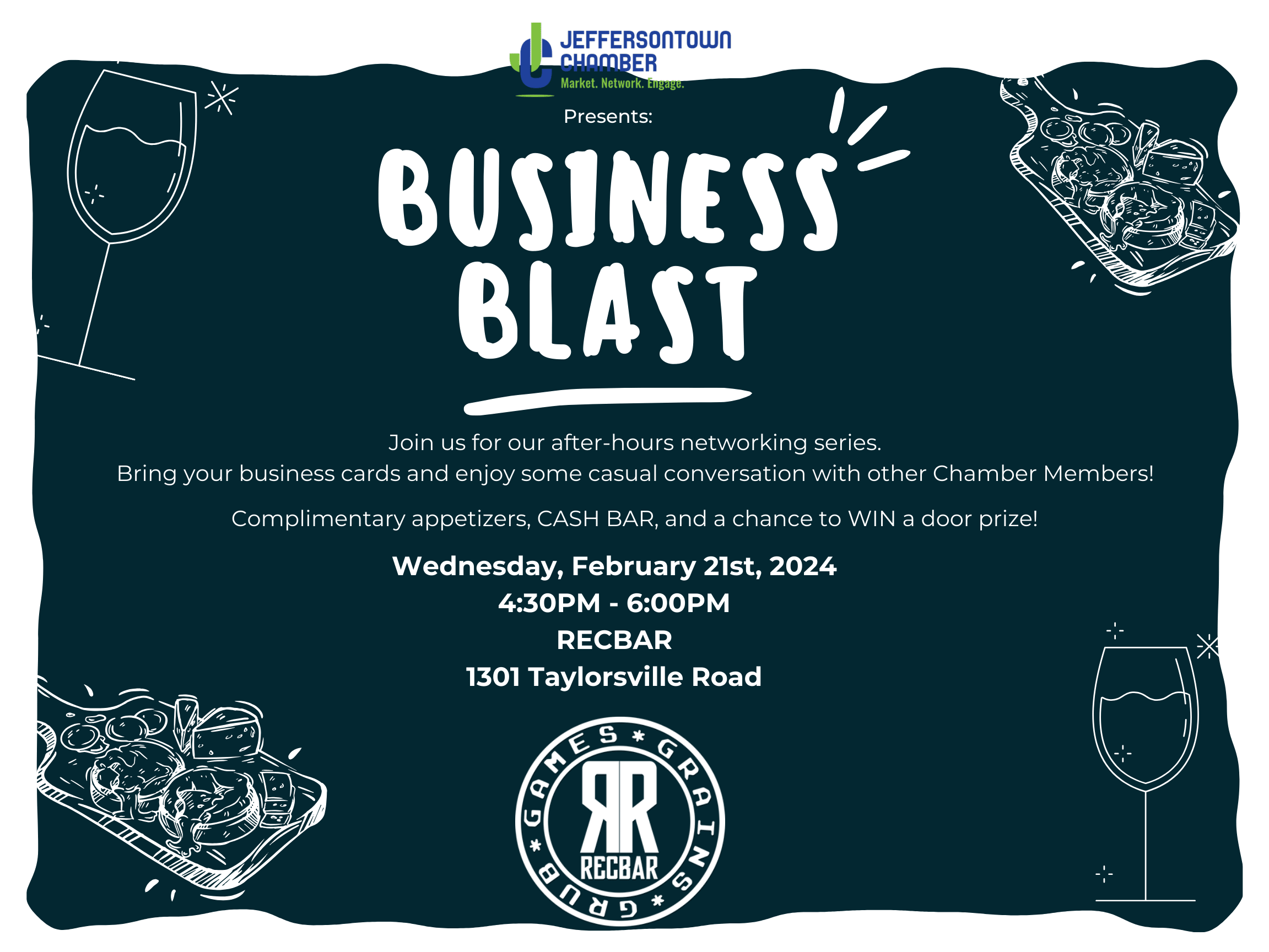 Join us for our after hour network series... Our Business Blast is just a casual evening of networking with other chamber members. There will a CASH bar, complimentary appetizers and a chance at winning a Door PRIZE!Additional Info