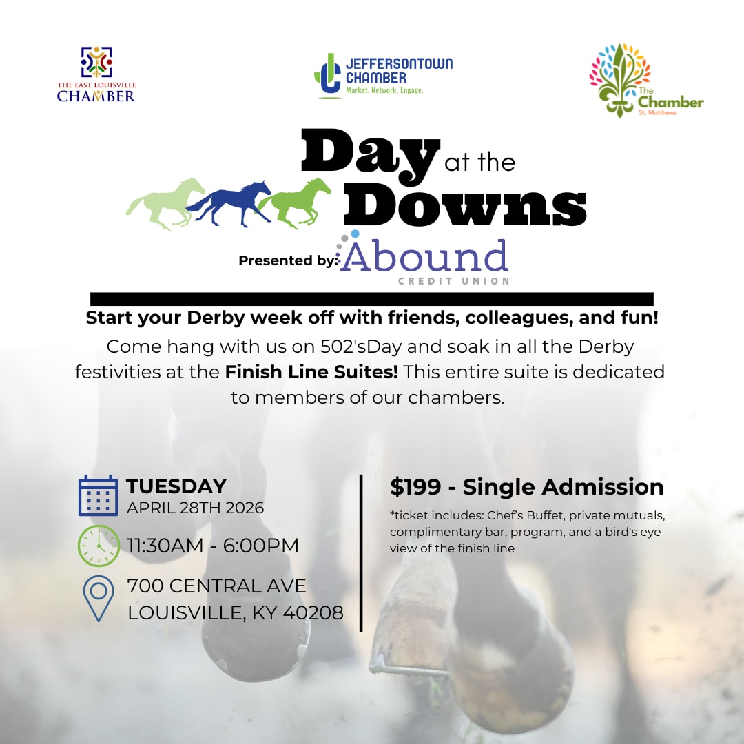 We’re teaming up with the Middletown Chamber and the The Chamber St. Matthews for a Chamber Day at the Downs! Come hang with us on 502'sDay and soak in all the Derby festivities! You won’t want to miss the fun, the races, and the great company!