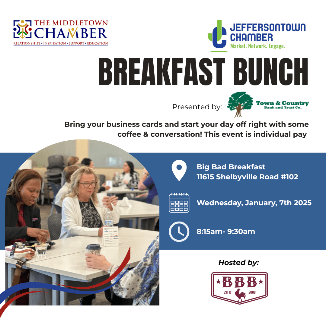 Join Us for the Jeffersontown Chamber Networking Breakfast Series Connect with fellow professionals, exchange business cards, and grow your network over breakfast in a relaxed, friendly setting. This is individual pay, so simply bring your appetite and plenty of business cards! Whether you're a long-time Chamber member or new to the area, this is a great opportunity to build relationships and promote your business.