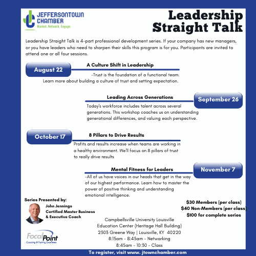Mental Fitness for Leaders: -Understanding the concepts of Emotional Intelligence and Positive Intelligence -Learn about the voices that are in your head and getting in the way of your own performance -Learn the keys of healthy mental mastery -C2A: An opportunity for a six-week, 17 program (partnership with the Chamber)Additional Info